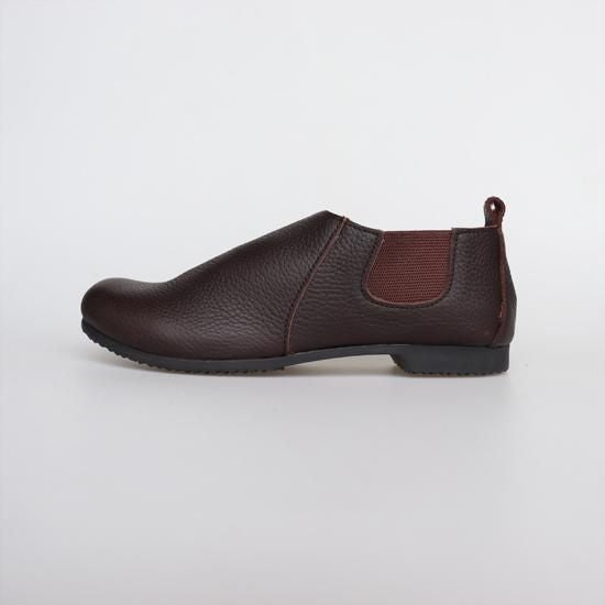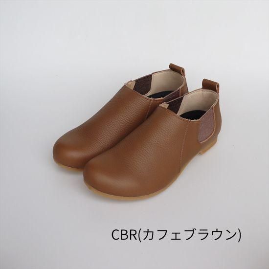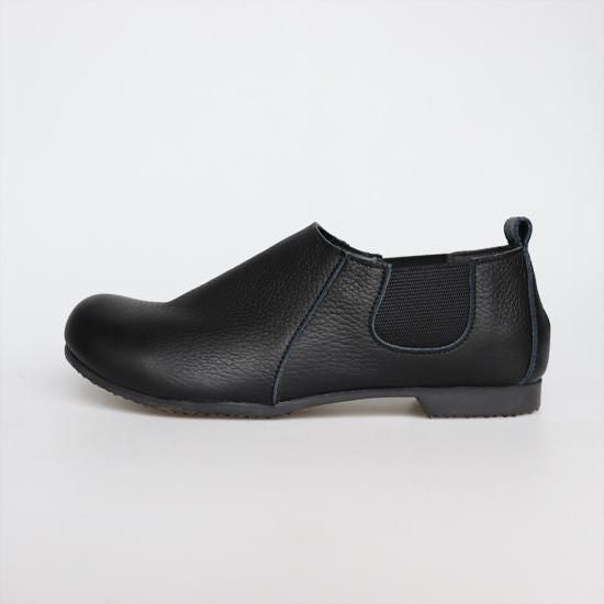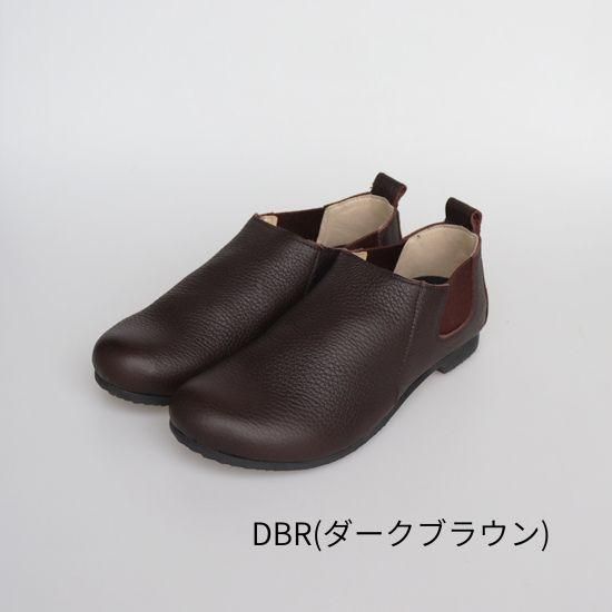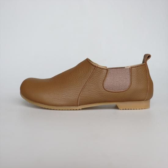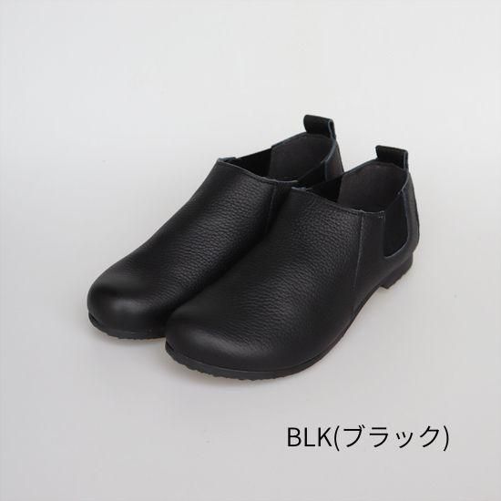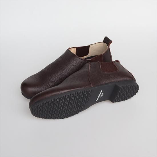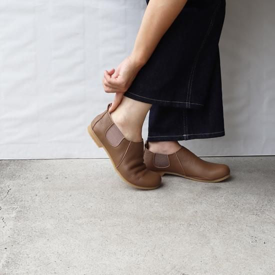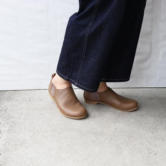 I wore them with 24cm cotton foot covers. The short length and side gore make them easy to put on. They look loose, so I was worried about my heels slipping off, but they don't slip at all! I have slender feet, so I had given up on a rounded shape, but these fit stress-free. They're roomy around the toes and comfortable around the ankles, so they fit well. They have a cute, natural feel. I'd like to coordinate them with colored socks and a skirt.