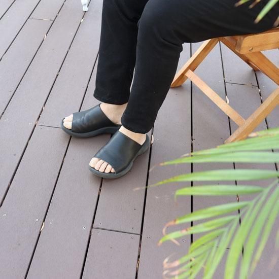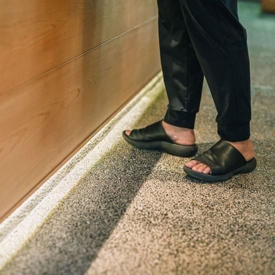 甲全体を包み込む幅広アッパーで安定感があり、脱ぎ履きもスムーズ。