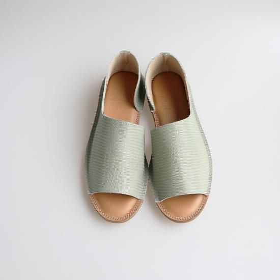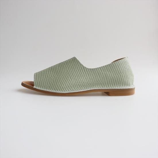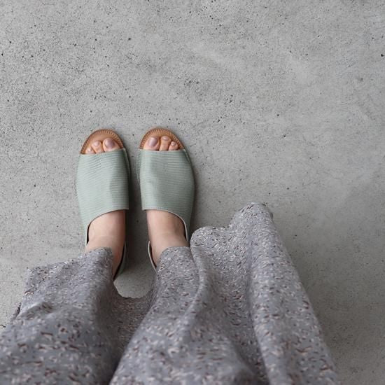 新色のGRNを着用しました。いつもどおり24cmでぴったりです。幅はややゆったり、細身の足ですが甲高のため甲のゆるさは感じませんでした。かかとが覆われているデザインでホールド感もあり、ミントっぽいグリーンに型押しがとてもかわいいです。